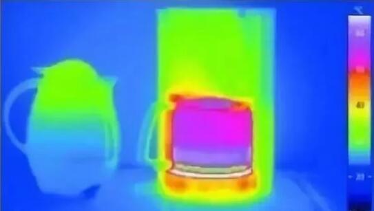右側(cè)的壺表面顏色較深,表示表面溫度高,散發(fā)出的熱量多,如要保溫還需要主動加熱,是“主動式的”。