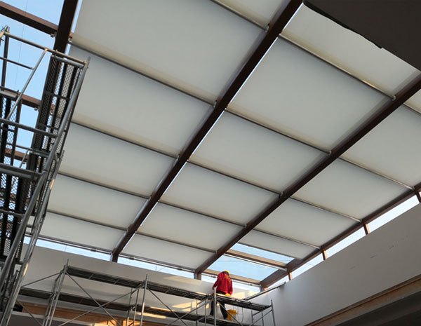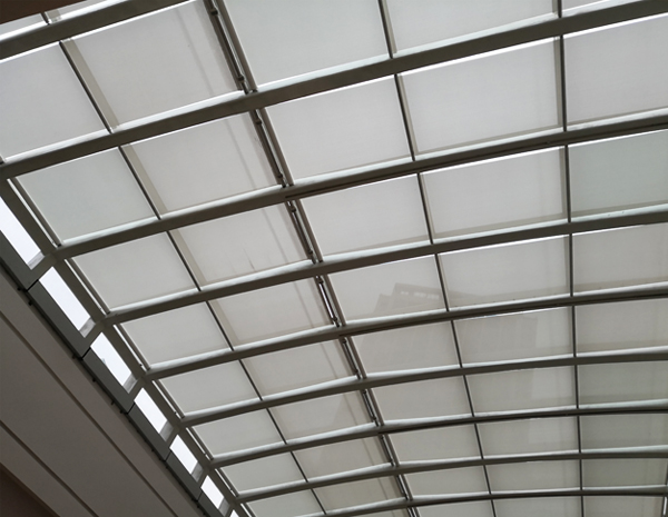 FSS天棚簾系統(tǒng)主要有管狀電機(jī)和彈性張力系統(tǒng)組成。一端為驅(qū)動(dòng)軸,內(nèi)裝管狀電機(jī);另一端為從動(dòng)軸,內(nèi)裝彈簧機(jī)構(gòu),電機(jī)正轉(zhuǎn)帶動(dòng)面料前行,另一端的彈簧逐漸收緊,將面料張挺,電機(jī)反轉(zhuǎn)彈簧逐漸放松,遮陽面料卷回。其操作簡(jiǎn)便,電機(jī)工作時(shí)噪音小,運(yùn)行平穩(wěn)。