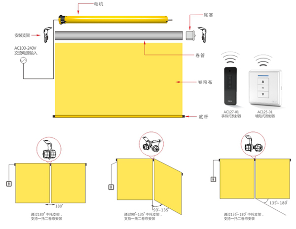 驅(qū)動電機、遙控器、控制器、卷管、遮陽面料、安裝支架、下低桿、傳動機構。